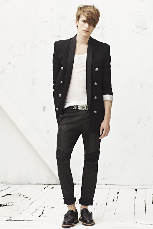 Olivier Rousteing carefully mixes the iconic styles of the male wardrobe: biker, safari, military and preppy living with absolute harmony. The silhouette tailored jackets have dry skin you wear shirts with cotton pants folded, the perfecto is mixed with a dinner jacket lapels and zip game, the biker jacket keeps the stitching and the military-inspired buttons worked and chooses bellows pockets.The Saharan squeezing at the waist and goes to the finished leather pants, t-shirt look and read the accompanying give way to minimal buttoned shirts, trench coats are rigorous and geometric, monochromatic palette. At the end is the same Balmain men...napoleonic-look jackets with big gold buttons, biker-ish vibe (jeans and co) with repeatitive colour palette: black, beige, white...with some new add, now an emerald green. A bit boring. 5